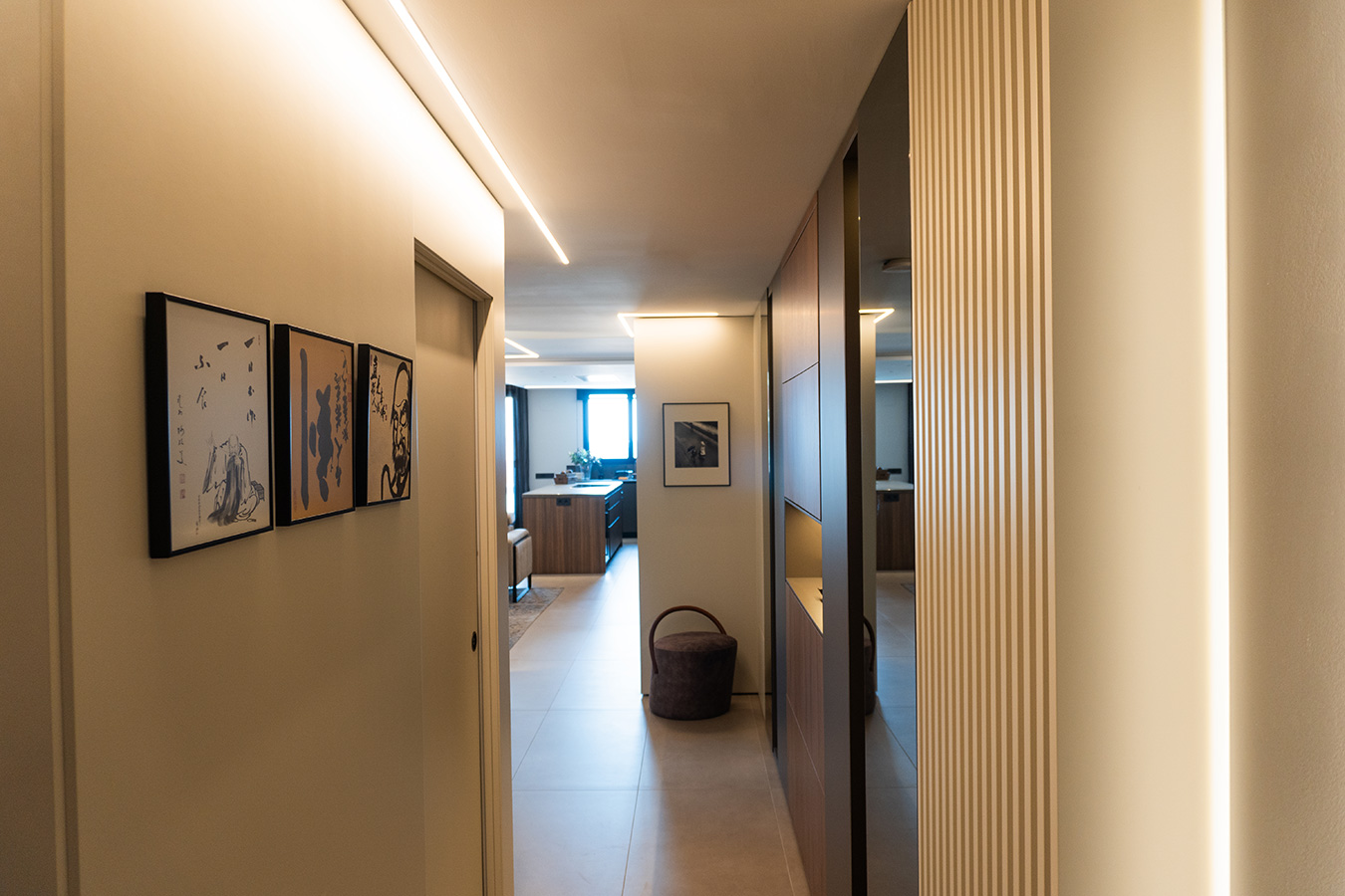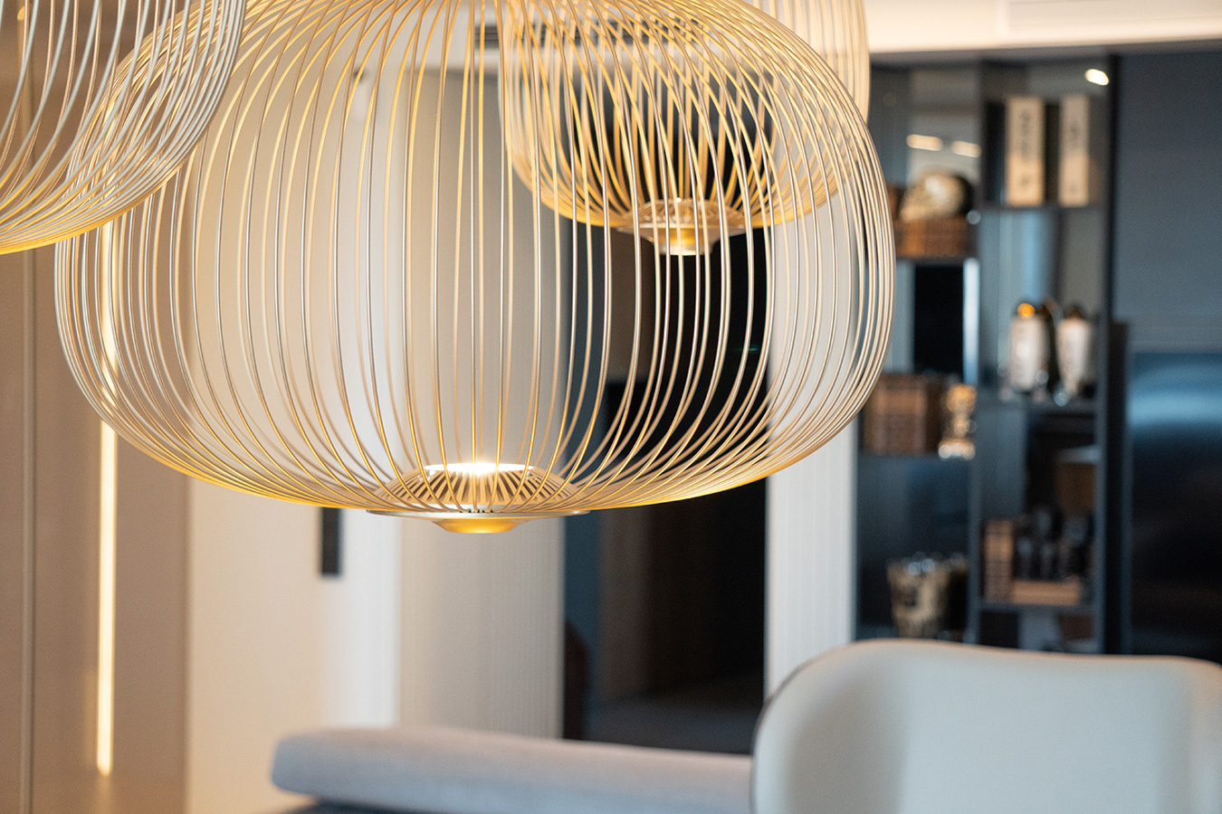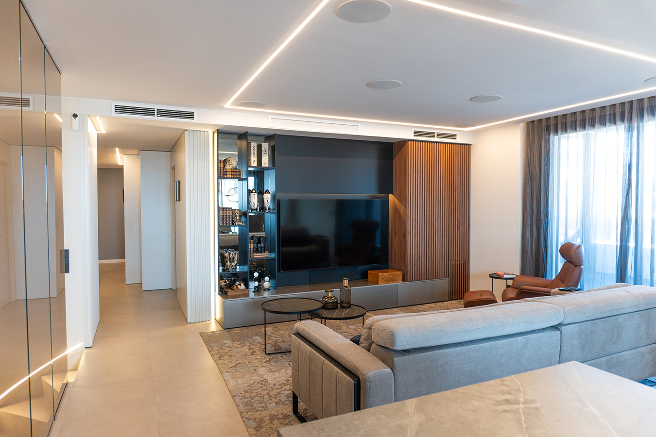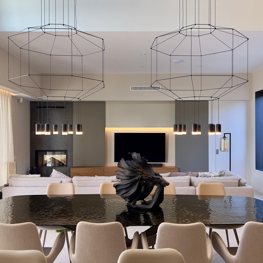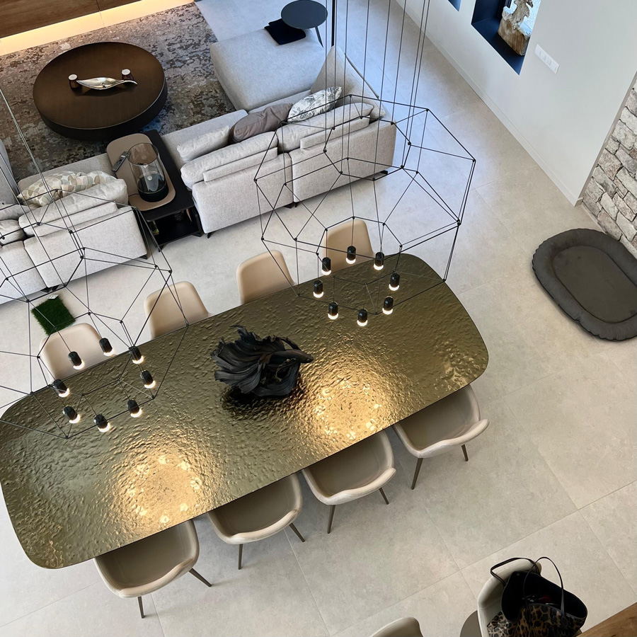 El salón combina un sofá modular de diseño italiano, una alfombra de Cattelan Italia y una mesa escultórica de Tonin Casa, realzada por lámparas doradas de Foscarini que aportan calidez y elegancia. El resultado es un entorno contemporáneo ideal para la vida social.