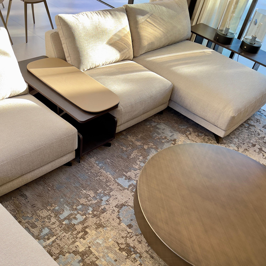El salón cobra vida con un sofá modular de Joquer, alfombra y mesa auxiliar de Cattelan Italia, reforzando la estética contemporánea. La piedra natural, la madera y los acabados metálicos aportan carácter, continuidad y un estilo coherente en toda la vivienda.