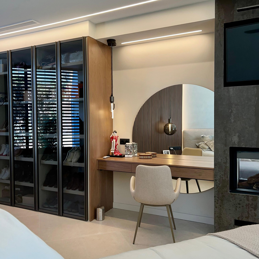 En el dormitorio, el diseño genera un refugio íntimo gracias al mobiliario a medida, la iluminación indirecta y los materiales nobles que transmiten serenidad.