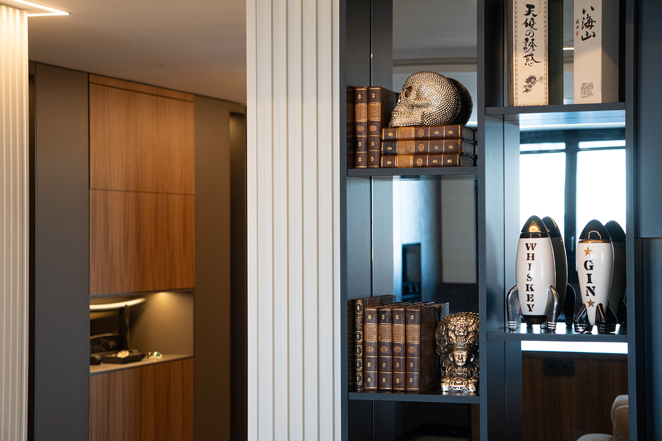 El salón principal incorpora mobiliario de diseño, como el sofá de Alexandra Colección, y una atmósfera cálida. La suite incluye una cama flotante LAGO, iluminación envolvente y textiles nobles. El vestidor, revestido en espejo, piel y laca brillante, ofrece una experiencia funcional y lujosa.