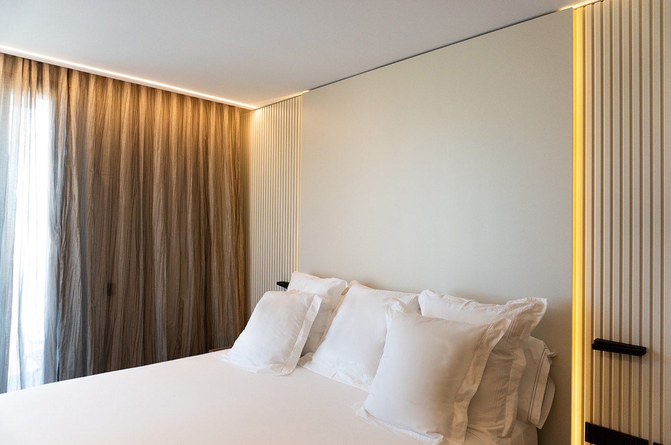 Los dormitorios evocan la exclusividad de un hotel boutique. Los cabeceros panelados con iluminación indirecta y los textiles de Bassols transmiten serenidad y confort.